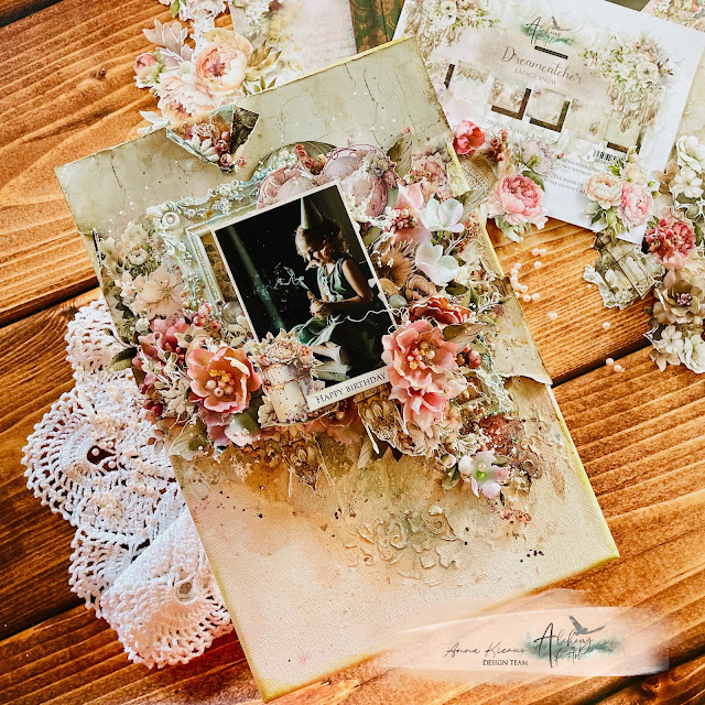 Pierwszy urodzinowy live już za nami. Stworzyłam na nim layout ze zdjęciem na podobraziu z kolekcji "Dreamcatcher". Bogactwo kolorów, różnorodność grafik, przepiękne kwiaty z arkusza do wycinania, wszystko to sprawiło, że moja praca jest bardzo romantyczna, kobieca i radosna, jak przystało na urodziny. Layout wzbogaciłam dodatkowo ramkami z odlewów z żywicy, kwiatami materiałowymi, koronką, suszkami oraz kuleczkami styropianowymi i perełkami.