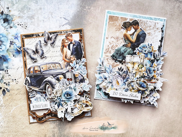 dzisiaj mam dla Was dwie ślubne karteczki. Najnowsza kolekcja In Frosty Colors pasuje mi idealnie do takich uroczystości. Karteczki nie są zbyt duże, mieszczą się w kopercie ale maja jednak trochę przestrzeni. Chciałam dodać im trochę klimatu dlatego wykonane są na bazie z ozdobnym wykończeniem. Dodatkowo trochę blasku by się przydało, więc odrobina szkła i cekinów znalazła się na moich kartkach.