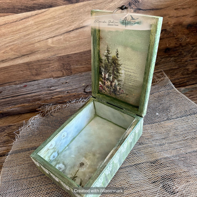Today I would like to show you something that immediately brought a bit of fairy tale atmosphere to my studio. A box decorated with the beautiful “World of Fairies” collection has settled on my desk. The very motif of this collection transports me to a magical, enchanted forest full of small wonders. I decorated the lid of the box with rice paper from the same series, which I applied using the decoupage method. I lined the center of the box with scrap paper, also from this collection. The lid couldn't miss the details - there were impressions of mushrooms made of lightweight paste, which completed the whole. I hope I will inspire you to create your own magical nook.